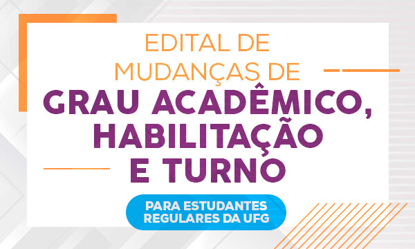 A Universidade Federal de Goiás (UFG), por meio da Pró-Reitoria de Graduação (Prograd) e do Centro de Gestão Acadêmica (CGA), torna público o edital do processo seletivo para mudanças de grau acadêmico, habilitação e/ou turno nos cursos de graduação presenciais da UFG, para o primeiro semestre do ano letivo de 2023, destinado a estudantes da UFG que se encontrem matriculados, no mínimo, em um componente curricular, ou com matrícula trancada ou participando de programa de intercâmbio ou de mobilidade estudantil.