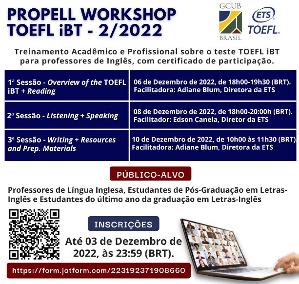 O Workshop é fruto da parceria entre a Educational Testing Service - ETS, organização responsável pelos exames TOEFL iBT e GRE em todo o mundo, e o Grupo de Cooperação Internacional de Universidades Brasileiras - GCUB.