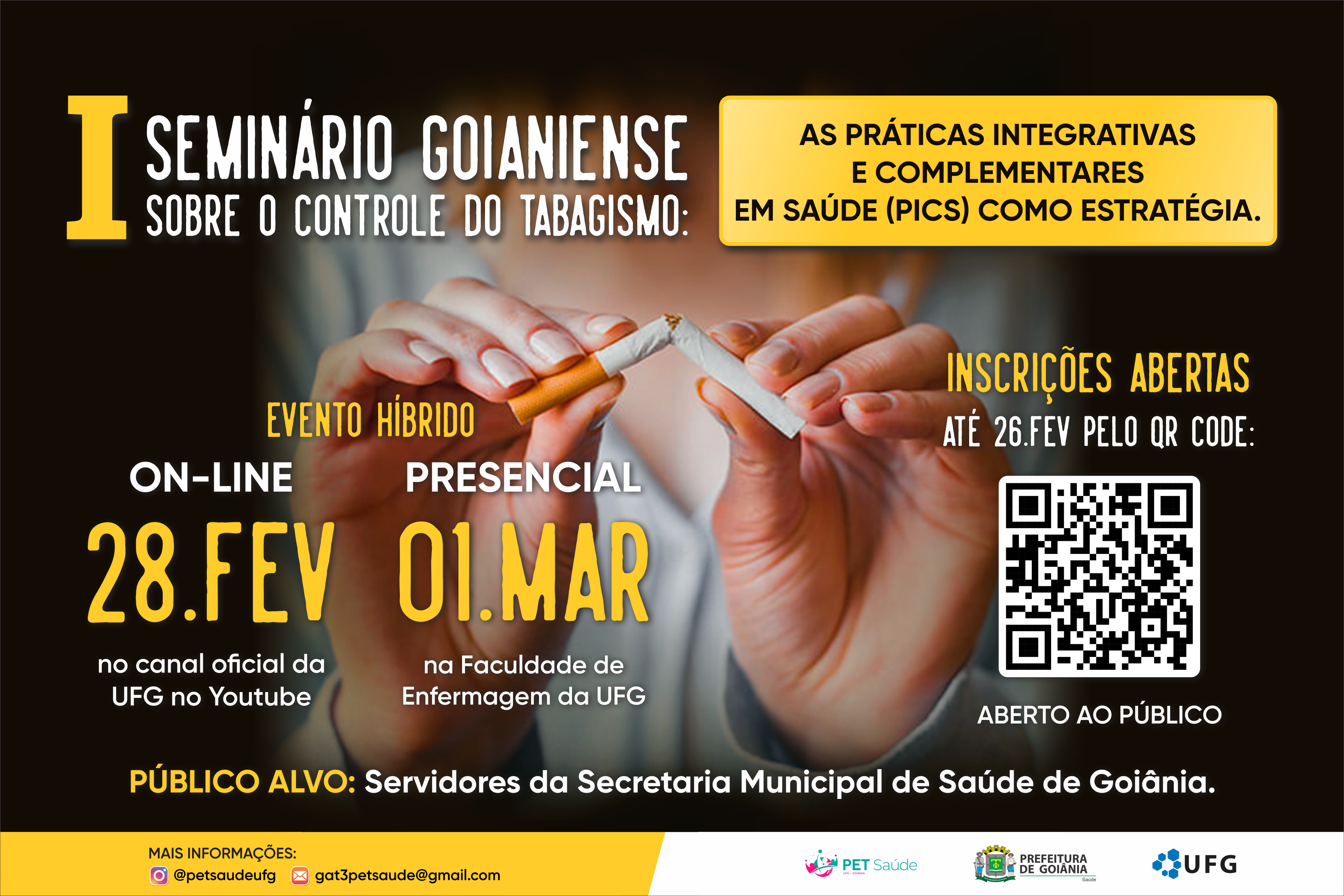 O Grupo de Aprendizagem Tutorial (GAT) 3, do Programa de Educação pelo Trabalho para a Saúde (PET Saúde) Gestão e Assistência (UFG e SMS-Goiânia), promove nos dias 28 de fevereiro e 1° março, o “ I Seminário Goianiense sobre o Controle do Tabagismo: As Práticas Integrativas e Complementares em Saúde (PICS) como estratégia”. Coordenado pela professora do Instituto de Patologia Tropical e Saúde Pública (IPTSP), da Universidade Federal de Goiás (UFG), Thaís Rocha Assis, o GAT 3 tem como temática de trabalho a reorganização da rede de atenção à saúde pós-covid, com foco nos grupos de controle do tabaco, juntamente com a realização das práticas integrativas e complementares em saúde.
