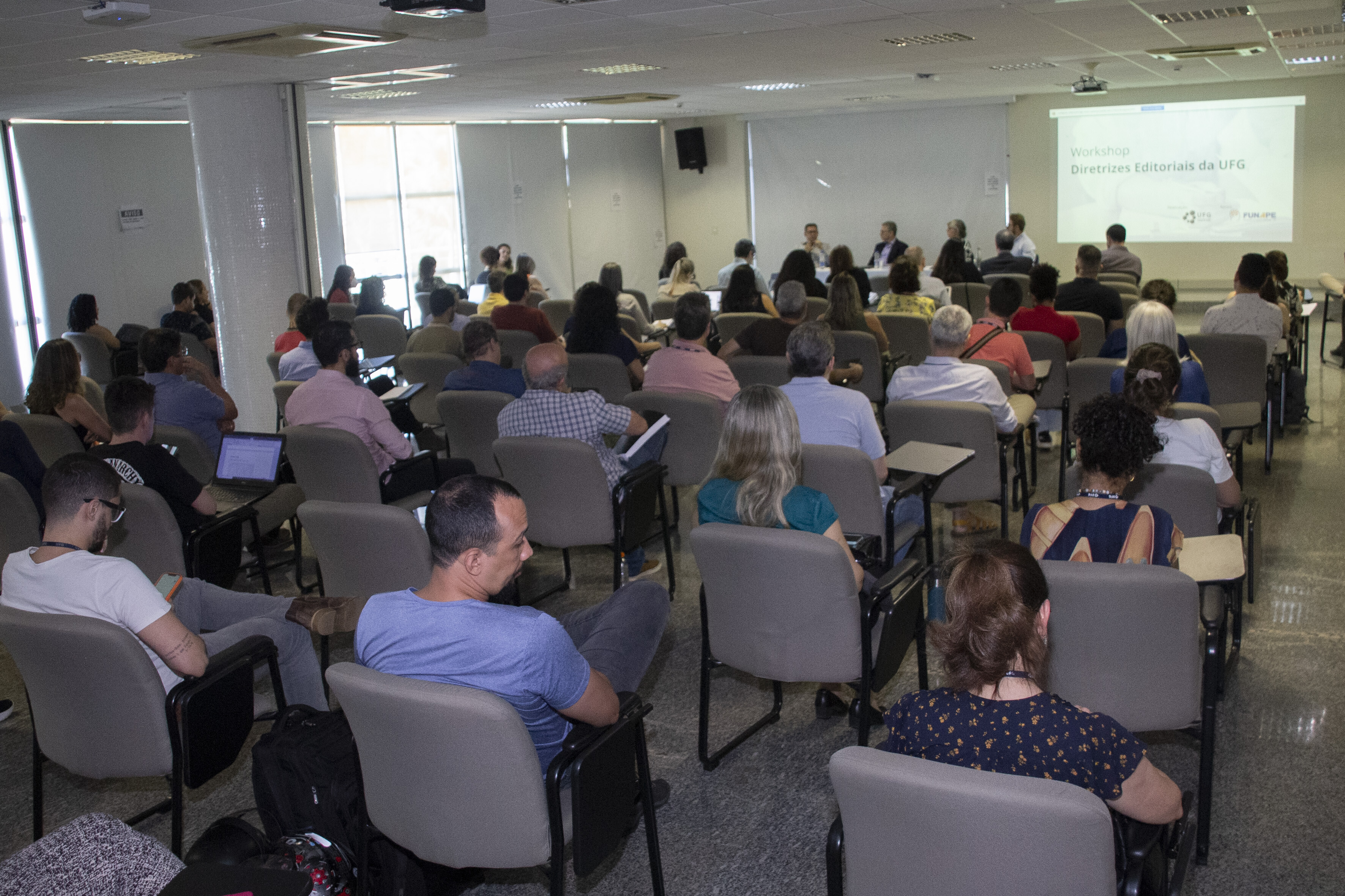 Na tarde de terça-feira, 8/8, no Centro de Eventos Prof. Ricardo Freua Bufáiçal, foi realizado o Workshop "Diretrizes Editoriais da UFG". O objetivo da Pró-reitoria de Pós-Graduação da Universidade Federal de Goiás (PRPG/UFG) era o de promover, junto à comunidade universitária, um debate sobre a atual organização de publicações na Universidade. Estiveram presentes na mesa-diretiva, o vice-reitor da UFG, Jesiel Carvalho; a pró-reitora de Pesquisa e Inovação, Helena Carasek, e o pró-reitor da PRPG, Felipe Terra.