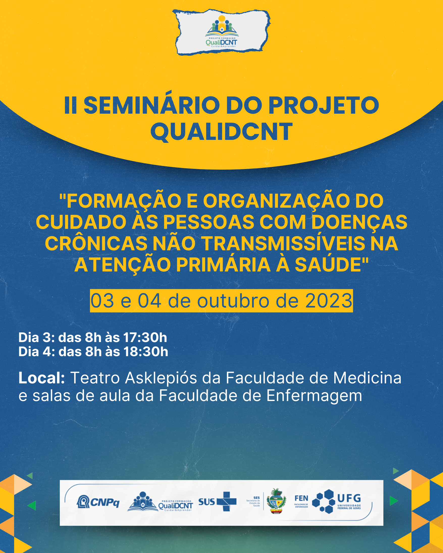 Nos dias 3 e 4 de outubro, será realizado o 2º Seminário do Programa de Formação QualiDCNT, que tem como objetivo geral promover a difusão de conhecimento sobre gestão de cuidados de pessoas com Doenças Crônicas Não Transmissíveis (DCNT) na Atenção Primária à Saúde (APS). O público-alvo serão profissionais da saúde, gestores da área da saúde, estudantes de graduação e pós-graduação, docentes e cursistas do Programa de Formação QUALIDCNT.