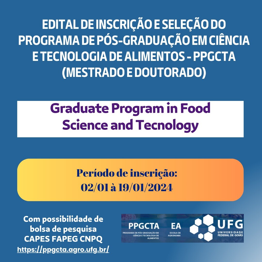 A Coordenadoria do Programa de Pós-Graduação em Ciência e Tecnologia de Alimentos (PPGCTA) - da Escola de Agronomia da Universidade Federal de Goiás torna público o Edital de Seleção para alunos(as) regulares, nos níveis de Mestrado e Doutorado. O período de inscrições começa no dia 02 de janeiro de 2024 e segue até o dia 19 do mesmo mês.