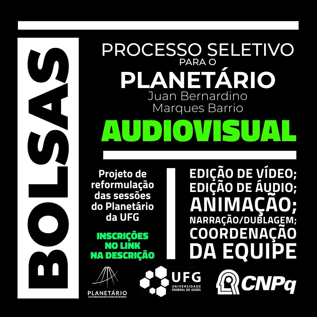 Quer fazer parte da equipe que irá trabalhar na reformulação das apresentações do Planetário Juan Bernardino Marques Barrio, da Universidade Federal de Goiás (UFG)? Então se inscreva neste edital que está oferecendo bolsas fomentadas pelo Conselho Nacional de Desenvolvimento Científico e Tecnológico (CNPq), com recursos conseguidos pela proposta 407.481/2022-2, vencedora da chamada CNPq/MCTI/FNDCT nº 39/2022 - Linha 2 - Revitalização da infraestrutura e do acervo de espaços científico-culturais existentes. Os produtos deste projeto serão utilizados nas apresentações do Planetário da UFG e disponibilizados gratuitamente para outros planetários do País, podendo alcançar de dezenas a centenas de milhares de pessoas por ano.