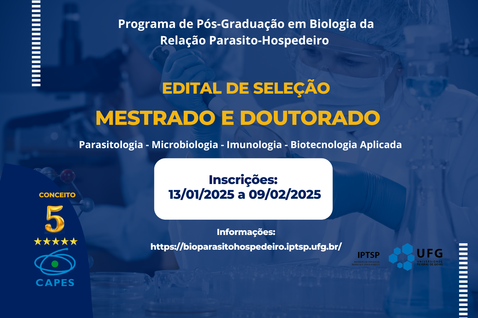 O Programa de Pós-Graduação em Biologia da Relação Parasito-Hospedeiro (PPGBRPH), da Universidade Federal de Goiás (UFG) publicou o Edital 001/2025 para os cursos de Mestrado e Doutorado.