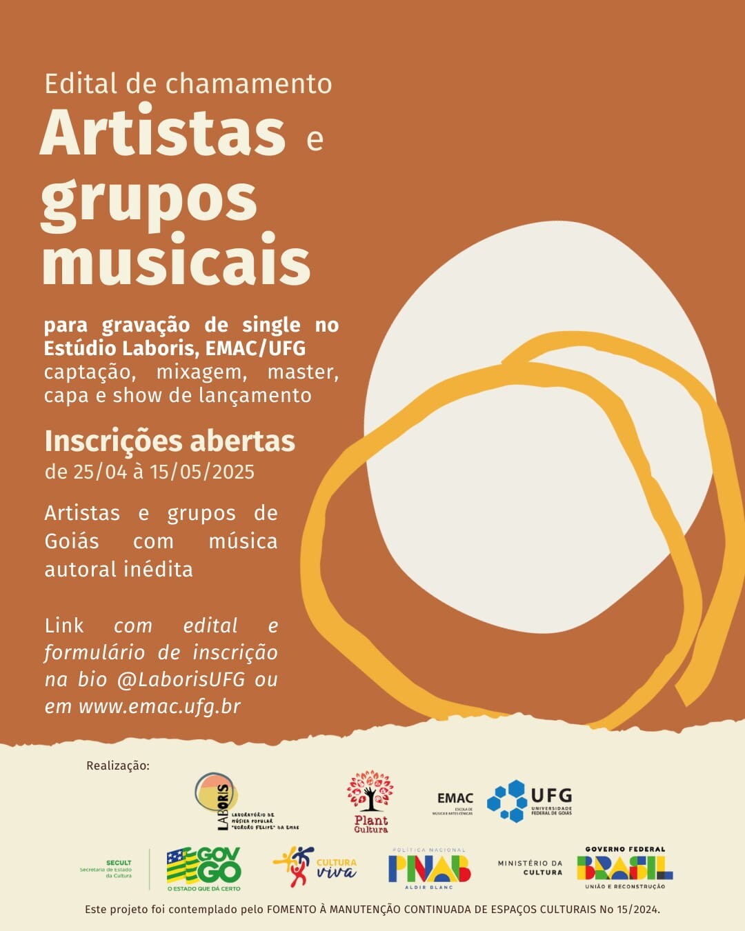 O Laboratório de Música Popular “Bororó Felipe” (Laboris) da Escola de Músicas e Artes Cênicas da Universidade Federal de Goiás, representado pela “Plant Cultura e produções” por meio do projeto contemplado pelo Fomento à manutenção continuada de espaços culturais N. 15/2025 da Lei Aldir Blanc da Secretaria de Estado da Cultura (Secult Goiás), torna público o edital para seleção de propostas artísticas para gravação musical no Estúdio Laboris que faz parte integrante do projeto: “Laboris: um espaço para produção musical goiana”.