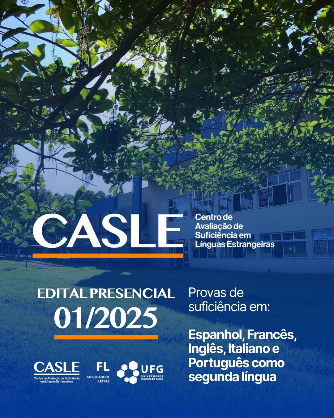 A Universidade Federal de Goiás (UFG), por intermédio do Centro de Avaliação de Suficiência em Línguas Estrangeiras (Casle), divulga chamada pública e convida candidatos a programas de pós-graduação, stricto sensu, a se apresentarem ao processo seletivo para provas de Espanhol, Francês, Inglês, Italiano e Português do Edital 1/2025, presencial, em conformidade com as normas do Regulamento do Casle (FL, 2024). O período de inscrições foi iniciado em 25 de junho e termina em 18 de julho de2025.