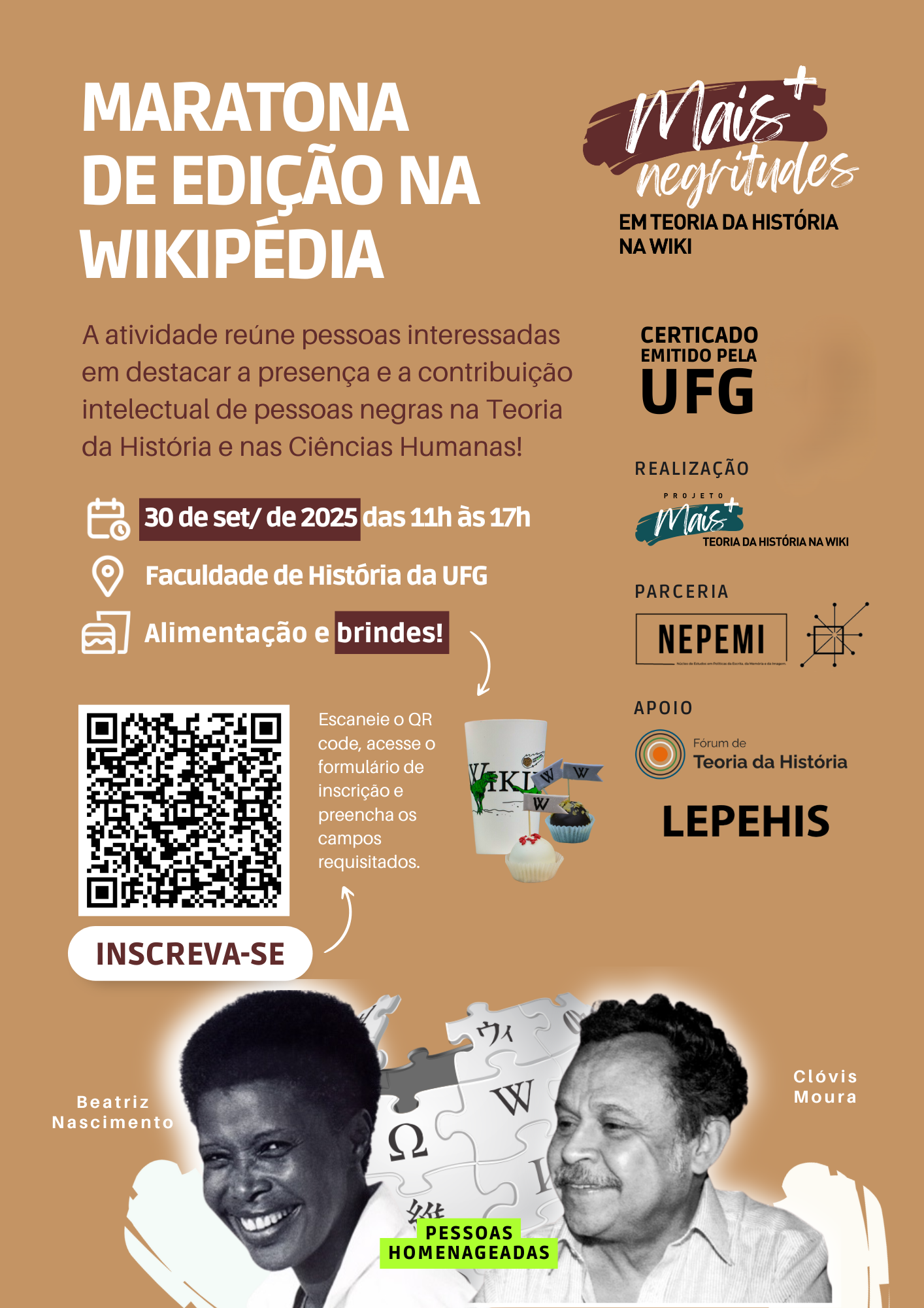 No próximo dia 30 de setembro, será realizada a maratona presencial de edição "Mais Negritudes em Teoria da História na Wiki". A atividade ocorre entre 11h e 17h, na Faculdade de História da UFG; é coordenada pelo professor Breno Mendes (UFG) e conta com apoio do Laboratório de Ensino, Pesquisa e Extensão em História (LEPEHIS/UFG) e do Fórum de Teoria da História.