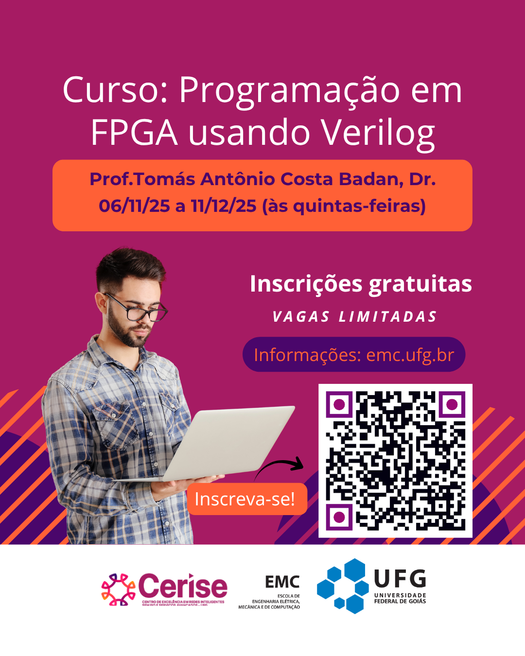 O Centro de Excelência em Redes Inteligentes Sem Fio e Serviços Avançados (Cerise) abriu 45 vagas para o curso "Programação em FPGA usando Verilog" ministrado pelo professor Tomás Antônio Costa Badan. Para se inscrever gratuitamente, preencha o formulário. Pré-requisito para acompanhar o curso: Conhecimentos em Eletrônica Digital 1 ou disciplina equivalente