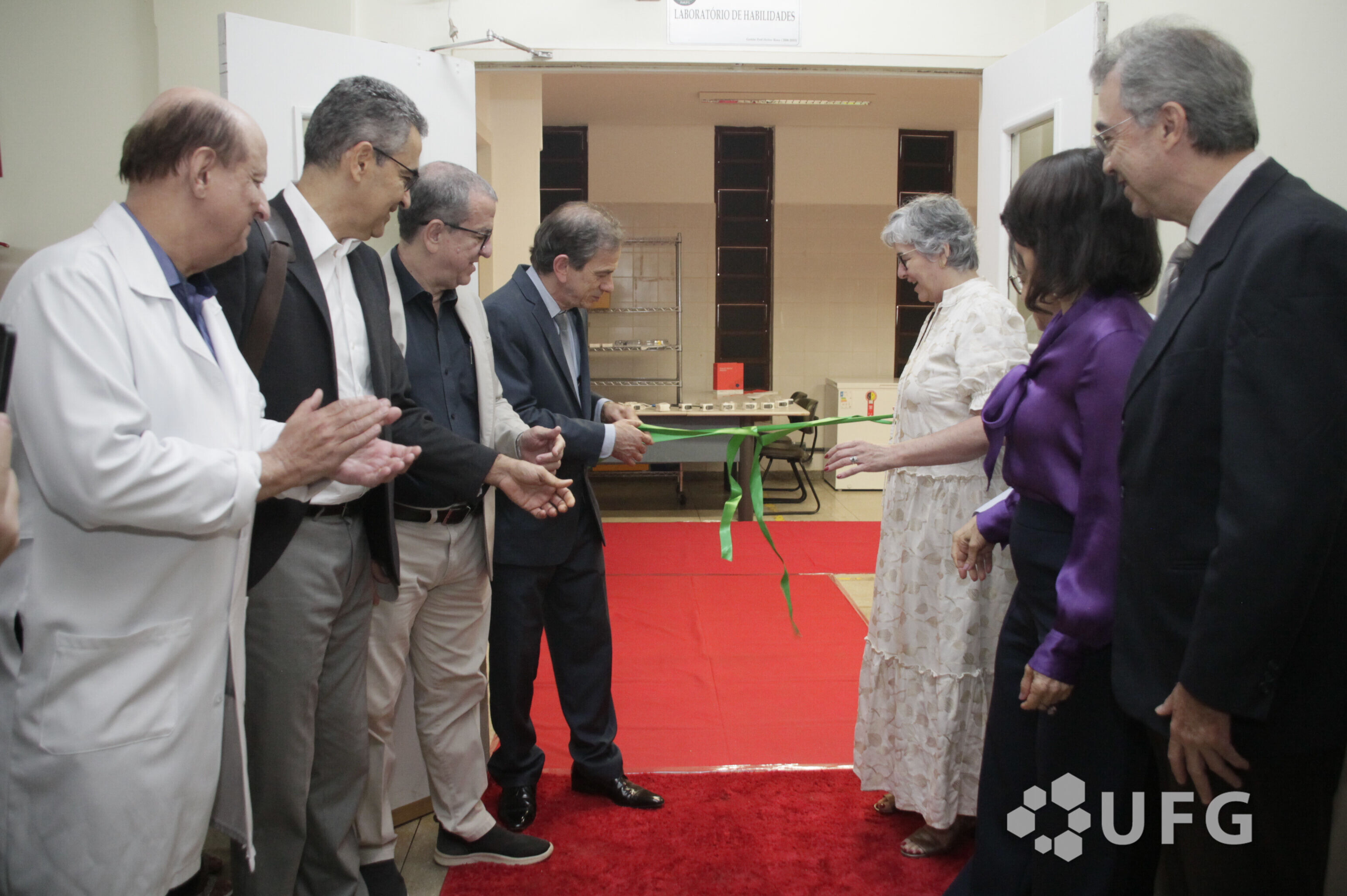 A mesa diretiva da solenidade foi composta pelo vice-diretor da FM UFG, Marcelo Rabahi; o superintendente do Hospital das Clínicas da UFG, José Garcia; pela reitora da UFG, Angelita Pereira de Lima; pelo vice-reitor da UFG, Jesiel Freitas Carvalho; pelo diretor da FM UFG, Waldemar Naves do Amaral; e pela professora da FM UFG e coordenadora do novo Laboratório de Simulação Robótica e Cirurgia Minimamente Invasiva, Fátima Mrue.