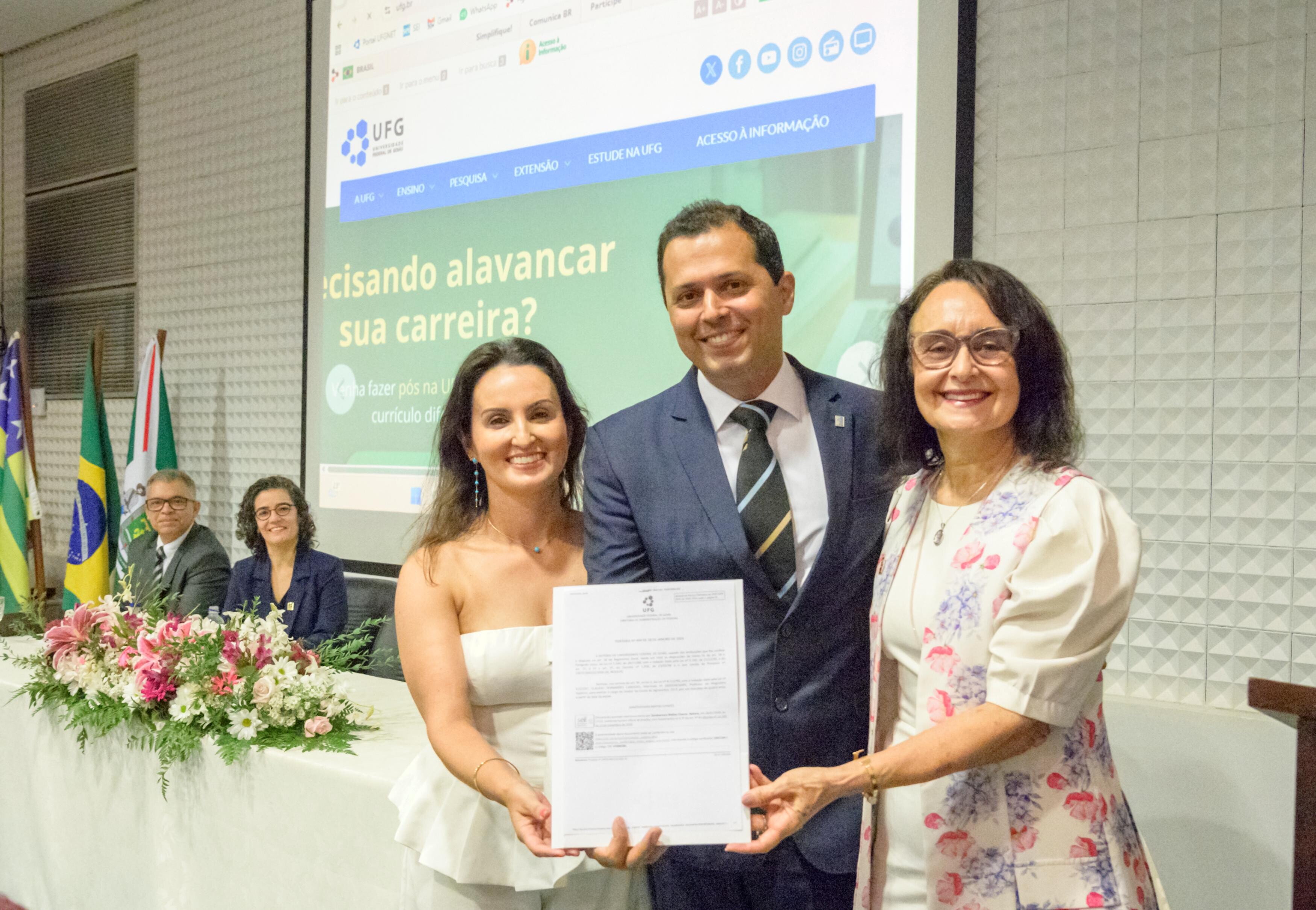 Francine Kalil (vice-diretora), Cláudio Cardoso (diretor) e Sandramara Chaves (reitora)