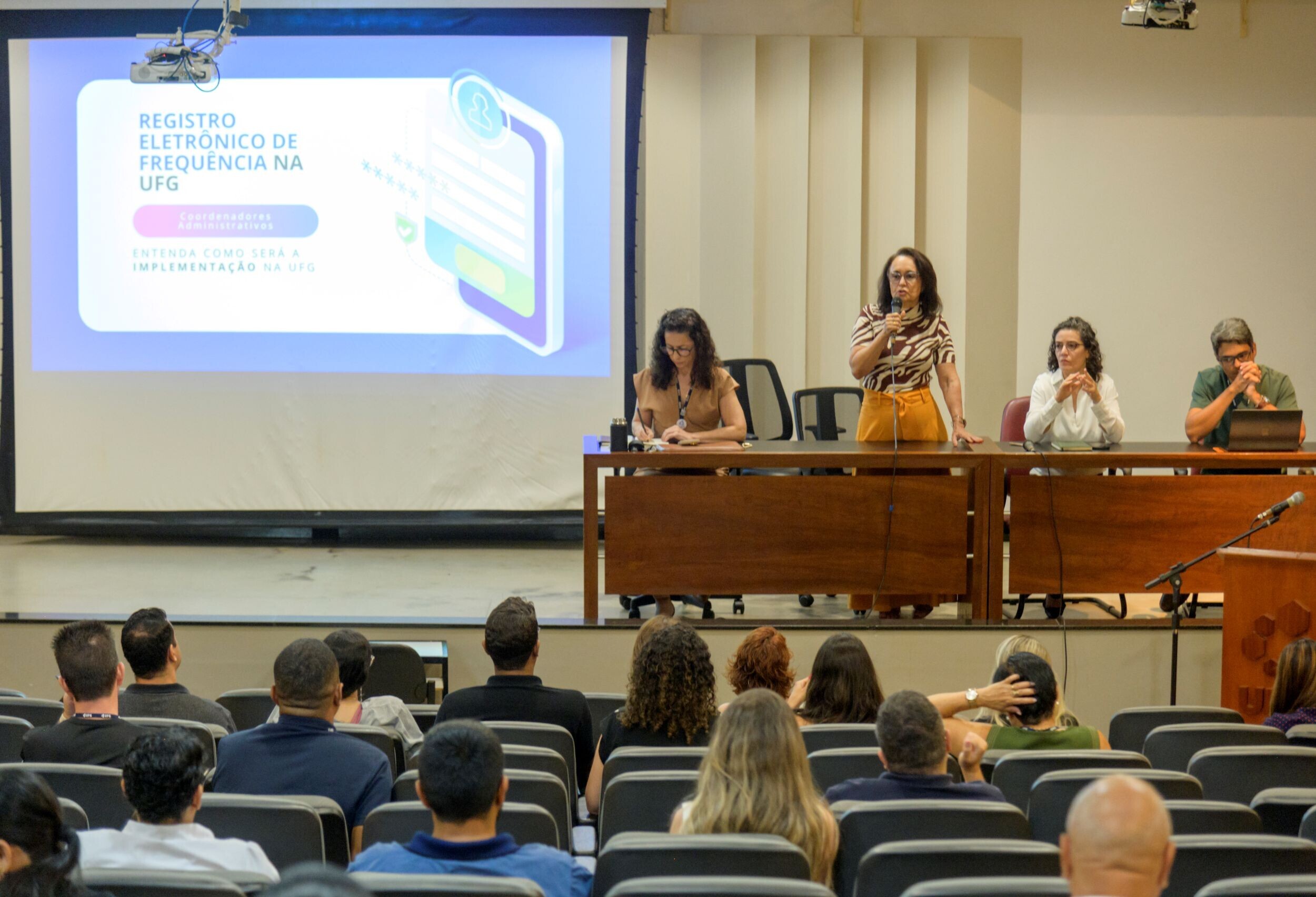 A Pró-Reitoria de Gestão de Pessoas da Universidade Federal de Goiás (UFG) promoveu uma reunião com os coordenadores administrativos das unidades acadêmicas e órgãos no auditório da Biblioteca Central na quinta-feira (19/2), para tratar sobre a implantação do registro eletrônico de frequência na Universidade. A reitora Sandramara Matias Chaves, a vice-reitora Camila Cardoso Caixeta, a titular e o adjunto da Propessoas Maria Tereza Tomé de Godoy e Juliano Soares conduziram o encontro.