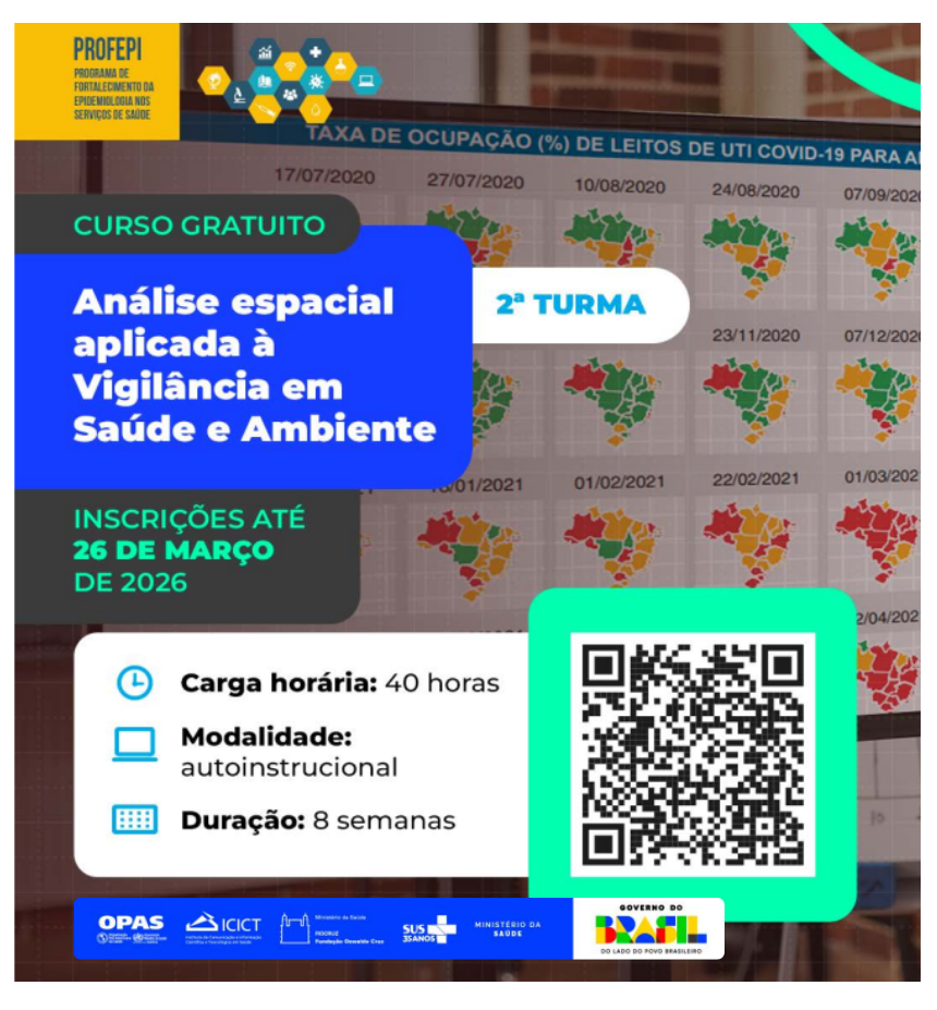 O Programa de Fortalecimento da Epidemiologia nos Serviços de Saúde (Profepi) está com inscrições abertas para o curso “Análise Espacial Aplicada à Vigilância em Saúde e Ambiente”. Estruturada em quatro módulos, a formação aborda temas como análise espacial e geoprocessamento na Vigilância em Saúde; conceitos fundamentais de geoprocessamento em saúde; métodos de análise espacial; e interpretação de mapas. O conteúdo busca qualificar profissionais para a utilização de ferramentas que auxiliem na tomada de decisão em saúde pública.