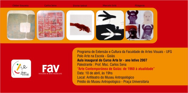 Aula inaugural do curso Arte Br (Arte na Escola) Em 05/04/07 13:34. Carlos Sena fará palestra sobre arte contemporânea em Goiás, na terça-feira, às 19h, no Museu Antropológico. Fonte: Assessoria de Imprensa TweetWhatsApp Listar Todas Voltar