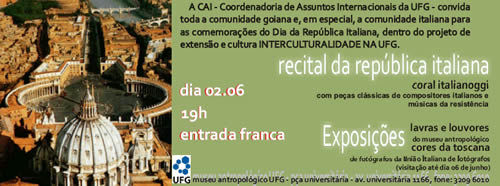 Nesta segunda-feira, dia 02 de junho, a Coordenadoria de Assuntos Internacionais (CAI) da Universidade Federal de Goiás (UFG) promove o Recital da República Italiana. Peças clássicas de compositores italianos e músicas de resistência serão apresentadas pelo Coral Italianoggi, às 19h, no Museu Antropológico da UFG. A entrada é franca.
