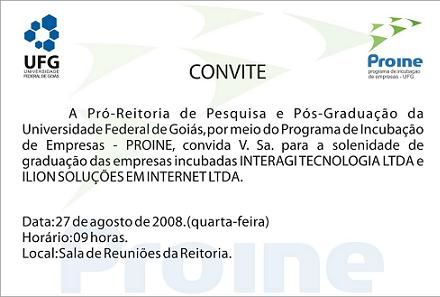 A Pró-Reitoria de Pesquisa e Pós-Graduação da UFG, por meio do Programa de Incubação de Empresas (Proine), promove nesta quarta-feira solenidade de graduação das empresas incubadas Interagi Tecnologia e Ilion Soluções em Internet. Às 9h, na sala de reuniões da Reitoria.