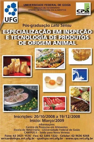 O Centro de Pesquisa em Alimentos (CPA) da Escola de Veterinária da Universidade Federal de Goiás (EV/UFG) abriu inscrições para o curso de Especialização e Inspeção em Tecnologia de Produtos de Origem Animal. As inscrições podem ser feitas, de 20 de outubro a 19 de dezembro, no CPA da Escola de Veterinária, no câmpus II da UFG, saída para Nova Veneza. As aulas terão início em março de 2009.