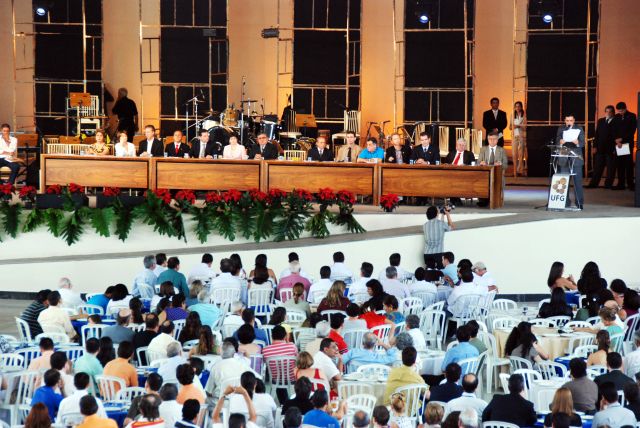 A Universidade Federal de Goiás (UFG) comemorou nesta sexta-feira, 12, pela manhã seu aniversário de 48 anos, com a inauguração do Centro de Cultura e Eventos Professor Ricardo Freua Bufáiçal, localizado no Câmpus Samambaia. A maior edificação da universidade, depois do Hospital das Clinícas, é um espaço próprio para grandes eventos, com capacidade para quatro mil pessoas sentadas. São 8,7 mil metros quadrados de área construída, incluindo acomodações diversas e um amplo palco. O design arrojado e a perfeita acústica são diferenciais do novo prédio que mudou o panorama do câmpus.