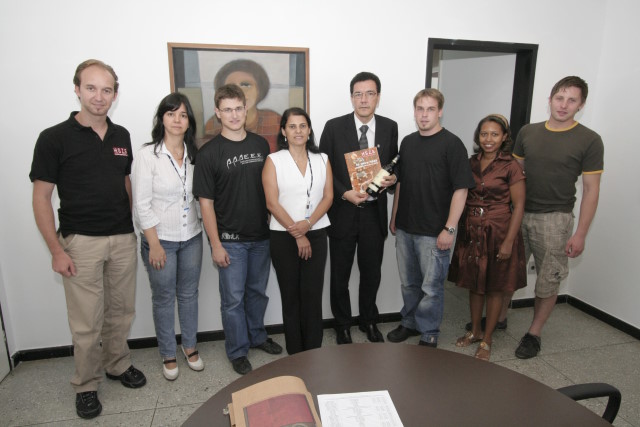 O reitor Edward Madureira Brasil recebeu nesta manhã de 3 de abril, em seu gabinete, para as despedidas, os quatro estudantes austríacos da Universidade de Tecnologia de Graz, Bernd Bodner, Robert Lurf, Peter Frank e Thomas Wieland, que chegaram a Goiás em 27 de fevereiro, em razão do Programa de Intercâmbio Internacional coordenado pela professora Cacilda de Jesus Ribeiro, da Escola de Engenharia Elétrica e de Computação (EEEC). Durante o encontro, os estudantes relataram as atividades realizadas por eles nesse período, que estarão descritas em um trabalho de conclusão de curso na universidade de origem. O reitor reforçou a intenção de ampliar o programa de intercâmbio para a participação de outros estudantes, sugerindo o estreitamento das relações com a Embaixada da Áustria.