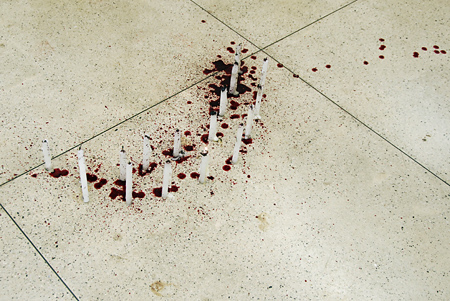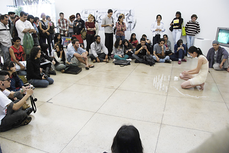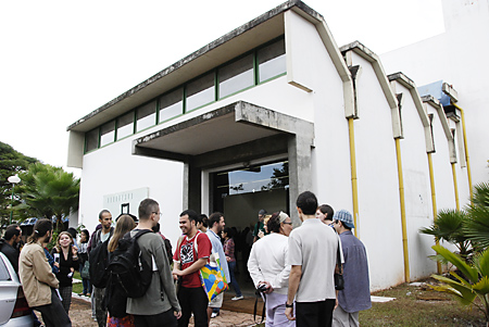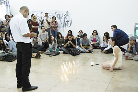 A exposição Temas e processos, realizada por alunos de Graduação, licenciatura e mestrado e ex-alunos da Faculdade e Artes Visuais (FAV), foi aberta nesta manhã na Galeria de Arte, com um total de 12 artistas expondo seus trabalhos. As obras revelam conceitos e intenções, e usam como recursos mediadores técnicas convencionais aliadas a recursos digitais e tecnológicos. Estão presentes na exposição vídeo, fotografias, pintura, escultura e instalação. Na abertura foi realizada a performance de Rafael Abdala e Terumi Kanda. Na apresentação a moça estava envolta em gazes e na sua frente havia várias velas. Um rapaz observa a cena, retira um garrote do bolso e coloca-o no braço. Depois o artista apaga vela por vela com o próprio sangue. A obra resultante da performance – as velas apagadas e o sangue no chão – farão parte da exposição.