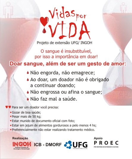 O Instituto de Ciências Biológicas está inaugurando, durante o VI Conpeex, o projeto de extensão Vidas por Vida, que visa incentivar as pessoas a se tornarem doadoras de sangue. O projeto, que tem parceria do Instituto Goiano de Oncologia e Hematologia (Ingoh), mantém desde ontem um estande durante todo o congresso, onde, além do receber de doações, os visitantes recebem instruções e informações, na tentativa de desmistificar o ato de doar sangue.