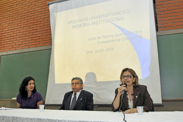 Em comemoração ao Dia do Arquivista, o Centro de Informação e Documentação Arquivística (Cidarq) e a Divisão de Comunicação da UFG promoveram uma palestra com a pró-reitora de Extensão e Assuntos Comunitários da Universidade Federal da Paraíba (UFPB), Lúcia Guerra, sobre Arquivos Universitários e Memória InstitucionalA palestra ocorreu na manhã do dia 20, no auditório do prédio que abriga os cursos de História, Filosofia e Ciências Sociais. Na ocasião também estiveram presentes a arquivista Heloísa Esser e o vice-reitor da UFG, Benedito Ferreira Marques. Heloísa falou da importância do arquivista, que tem como uma das principais funções possibilitar que todos tenham acesso à informação. A arquivista também lembrou do trabalho realizado pela Divisão de Comunicação no resgate de arquivos históricos, como o projeto "Revelando Memórias" e convidou todos a irem ao arquivo da UFG, que está aberto à comunidade. Já o vice-reitor ressaltou a importância da comemoração e disse se tratar também de um momento de reflexão e que a memória de um povo tem que ser sempre guardada. "Um município, por menor que seja, não terá história se não tiver o seu arquivo", declarou Benedito Ferreira Marques.