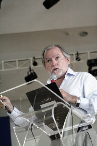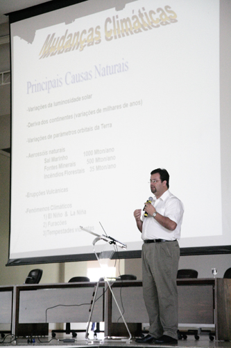 O professor Gilvan Sampaio, do Instituto Nacional de Pesquisas Espaciais (INPE), proferiu a palestra “Ciência e desenvolvimento regional: os desafios do Brasil frente às mudanças climáticas”. O convidado expôs as consequências da interferência humana na atmosfera e explicou o efeito estufa. De acordo com Gilvan Sampaio, é um fenômeno que acontece naturalmente, mas as ações humanas estão modificando a intensidade do processo, culminando no aumento da temperatura média do planeta. “O aquecimento global é um fato. Nosso desafio é entender quais serão os impactos no Brasil e no restante do mundo”, sentenciou.