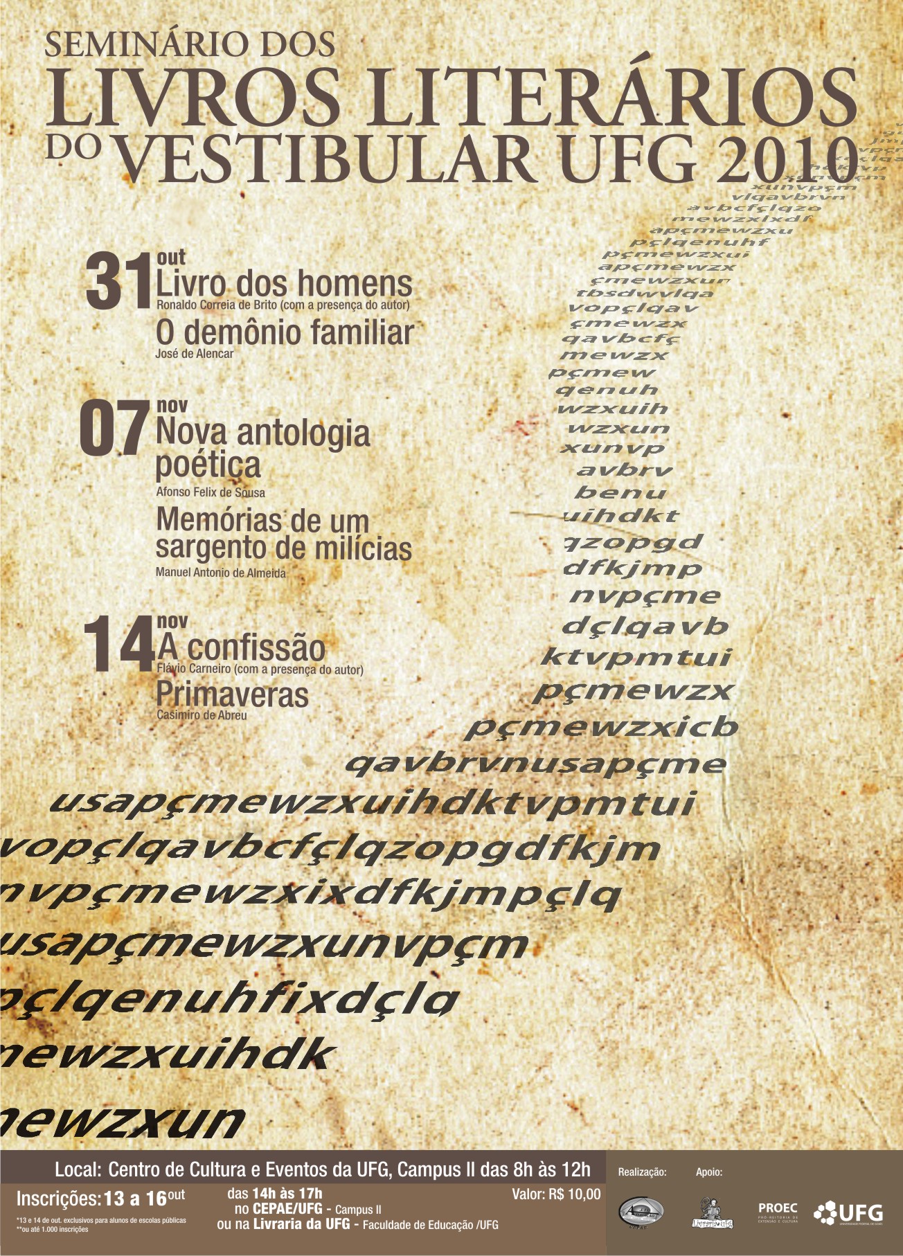 A UFG continua com a série “Seminário dos Livros Literários do Vestibular”. O segundo encontro será realizado no próximo sábado, dia 14 de novembro, a partir das 8 horas, com a presença de Flávio Carneiro, autor de A Confissão. O seminário está sendo realizado no Centro de Cultura e Eventos, no câmpus II. A entrada é franca. Participe!