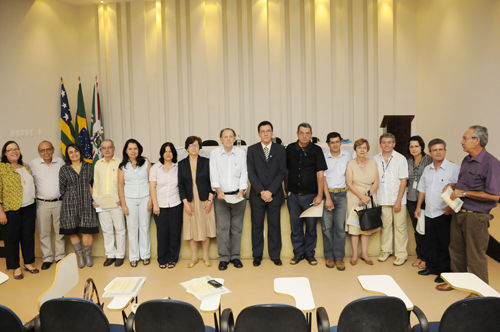Ao centro dos homenageados, o reitor da UFG, Edward Madureira Brasil