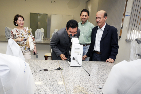 Ao microscópio o reitor Edward Madureira Brasil ao lado da representante do MEC, Adriana Weska e dos deputados federias Leandro Vilela e Rubens Otoni
