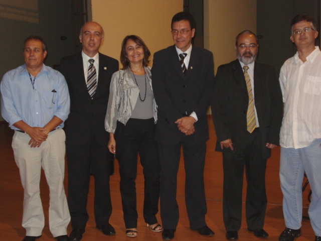 Da esquerda para a direita, o diretor do Câmpus Catalão, professor Manoel Rodrigues Chaves, o reitor da Universidade Federal do Triângulo Mineiro, professor Virmondes Rodrigues Junior, a pró-reitora de Graduação, professora Sandramara Matias Chaves, o reitor da UFG, professor Edward Madureira Brasil, o reitor da Universidade Federal da Grande Dourados, professor Damião Duque de Farias, e o presidente da comissão de elaboração do projeto de autonomia do Câmpus Catalão, professor Cláudio Lopes Maia.