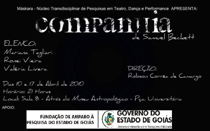A Companhia Máskara – Núcleo de Pesquisa do Espetáculo da Escola de Música e Artes Cênicas (Emac) da UFG - apresentará o espetáculo chamado Companhia, um clássico de Samuel Beckett, estreiado em 2009 no Festival Beckett em Buenos Aires, Argentina.