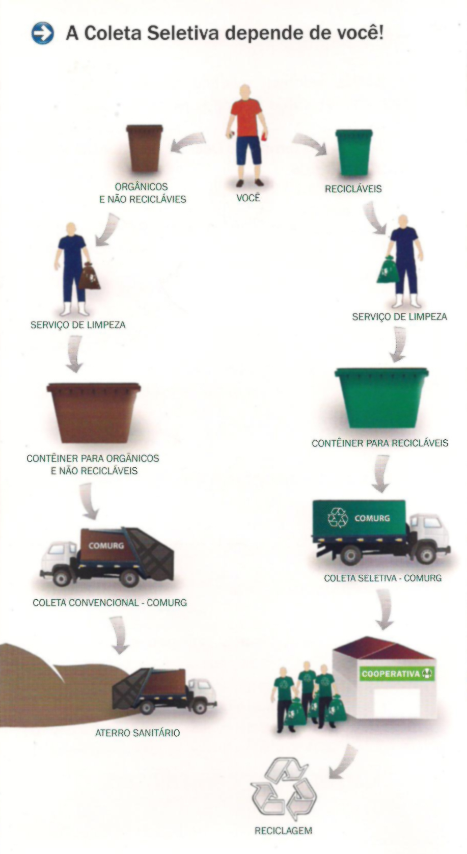 O processo começa nas unidades acadêmicas onde foram instaladas lixeiras verdes, para materiais recicláveis, e marrons, para orgânicos e não recicláveis. A partir desta divisão, os funcionários da limpeza vão recolher separadamente o lixo e colocar em contêineres específicos para os dois tipos de resíduos. Esses recipientes estão separados em dez pontos no câmpus (acompanhe na ilustração abaixo). O próximo passo será realizado pela Comurg, que irá recolher uma vez por semana os materiais recicláveis e distribuir nas cooperativas participantes do programa Incubadora Social, desenvolvido por meio da Pró-reitoria de Extensão e Cultura (Proec). “Ao separar o lixo, cada pessoa vai contribuir para inclusão social”, comentou o coordenador Fernando Bartholo. Ele também informa que o projeto preparou uma campanha educativa que passará por todas as salas do câmpus, conscientizando a comunidade acadêmica.