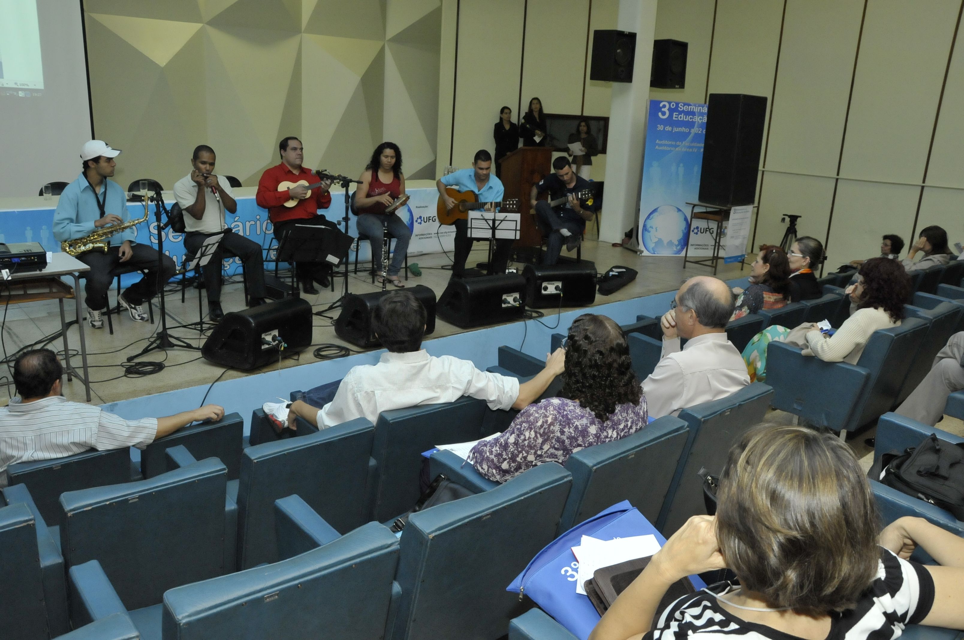 Com o tema Aprendizagens em processos virtuais e presenciais, teve início o 3º Seminário de Educação em Rede promovido pela Faculdade de Educação da UFG e pelo Centro de Educação a Distância da Pontifícia Universidade Católica de Goiás (PUC-GO). A apresentação do Grupo de Choro do Teatro Escola Basileu França e a homenagem à professora aposentada pela UFG, Mirza Seabra Toschi, marcaram a abertura do seminário que ocorreu na noite de quarta-feira (30/06), no auditório da Faculdade de Educação da UFG. Na sequência, a professora Patrícia Lupion Torres, da Pontifícia Universidade Católica do Paraná (PUC-PR), proferiu a palestra sobre a aprendizagem em rede.