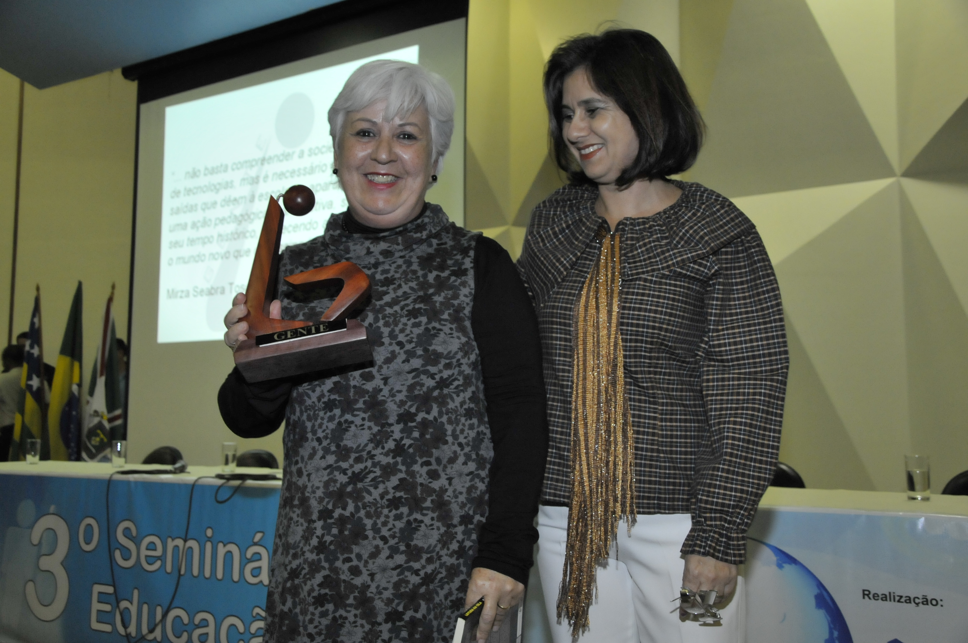 Professora homenageada Mirza Seabra Toschi, ao lado da professora da UFG Cleide Aparecida Carvalho Rodrigues