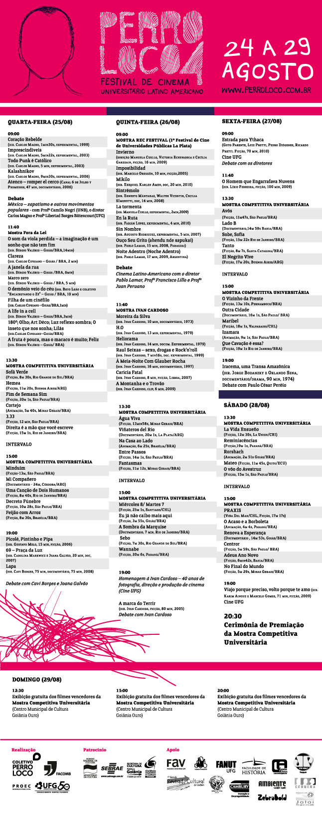 A quarta edição do Festival de Cinema Universitário Latino Americano – Perro Loco 2010 – começa no próximo dia 24 e prossegue até 29 de agosto, no Câmpus Samambaia da Universidade Federal de Goiás. O evento é o maior festival universitário de cinema da capital goiana e utiliza o audiovisual, a música e a arte para discutir aspectos socioculturais regionais e latinos com as comunidades.