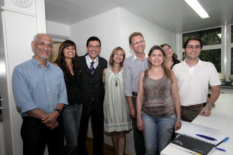 Da esquerda para direita: o diretor do ICB, professor Cirano José Ulhoa, a professora Elisângela Lacerda, o reitor da UFG Edward Madureira Brasil, a professora Rosângela Rocha, o deputado João Campos, a biomédica Nancy Vieira, o professor Érick Cruz e, à frente, a professora Nádia Bérgamo