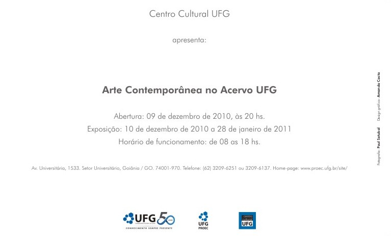 Exposição - A exposição “Arte Contemporânea no Acervo UFG”, com curadoria assinada pelo Diretor do Centro Cultural, artista plástico e professor Carlos Sena Passos –  reafirma o compromisso da UFG com a guarda, preservação e divulgação do patrimônio cultural, e mostra sua ação para criar uma ponte entre presente, passado e futuro, unindo gerações em torno da arte. O Acervo UFG conta atualmente com 222 obras nas categorias desenho, pintura, gravura, objeto, escultura, instalação, fotografia e vídeo-arte.