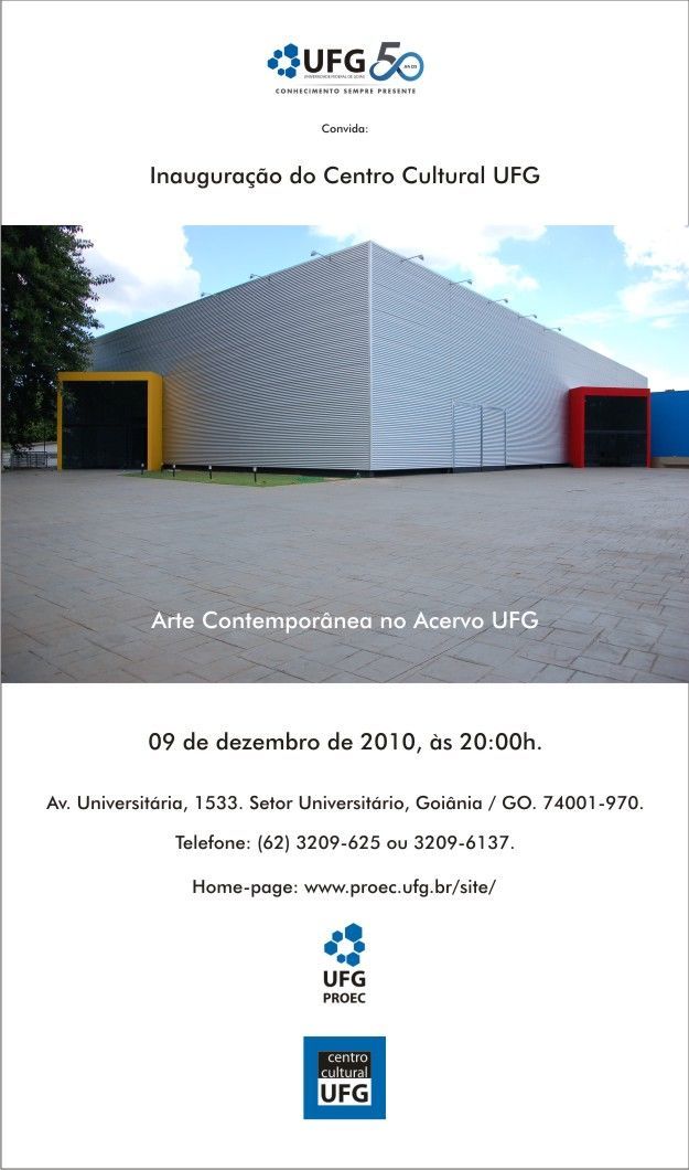 Dentro das comemorações de seu cinquentenário, a Universidade Federal de Goiás inaugura, no dia 09 de dezembro (quinta-feira), às 20 horas, o Centro Cultural UFG (CCUFG). Além disso, será aberta ao público a exposição “Arte Contemporânea no Acervo UFG”, que ficará em cartaz até o dia 28 de janeiro de 2011, e realizado o lançamento da revista UFG Afirmativa número 5, última edição histórica, referente ao período de 1990 a 2005.