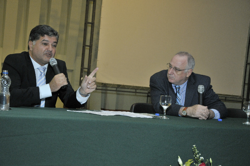 O secretário de Ciência e Tecnologia, Mauro Fayad (esquerda), e o secretário geral da SBPC, Aldo Malavasi (direita), durante rodada de perguntas do público que acompanhou a abertura da Reunião Regional