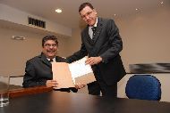 Foram reempossados na segunda-feira, 16/05, no auditório Professor Biolkino Ferreira, os professores Osvado Luiz Valinote e Orlando Ferreira Gomes, respectivamente diretor e vice-diretor da Escola de Engenharia Civil (EEC) da Universidade Federal de Goiás (UFG), para um novo mandato de quatro anos, cerimônia que contou com a presença do reitor da UFG, Edward Madureira Brasil, do vice-reitor, Eriberto Francisco Bevilaqua Marin, do pró-reitor de Desenvolvimento Institucional e Recursos Humanos, Jeblin Antônio Abraão, da pró-reitora de Graduação, Sandramara Matias Chaves, além de diretores de outras unidades, professores, servidores técnico-administrativos e alunos da Escola.