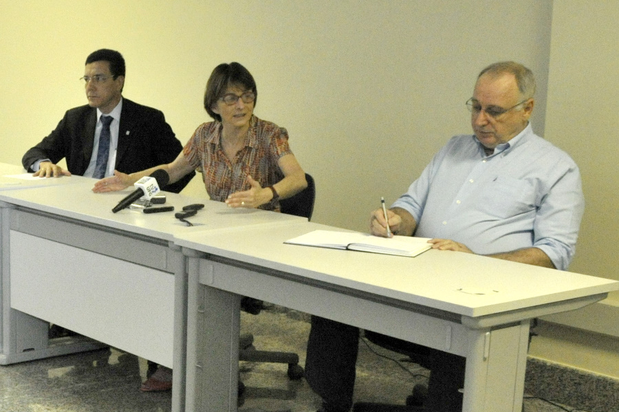 O reitor da UFG, Edward Madureira Brasil, a presidente da SBPC, Helena Nader e o secretário-geral da entidade, Aldo Malavasi, expuseram aos jornalistas presentes as principais informações sobre o evento científico.