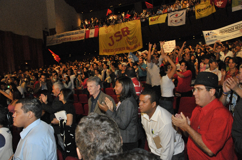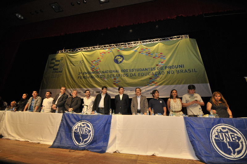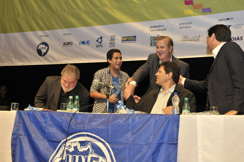 O ex-presidente Luís Inácio Lula da Silva e o ministro da Educação, Fernando Haddad, participaram hoje do 52º Congresso da União Nacional dos Estudantes (UNE) e do 2º Encontro Nacional do Programa Universidade para Todos (ProUni). A reunião ocorreu no teatro Rio Vermelho no Centro de Cultura e Convenções de Goiânia e contou com a presença do reitor da Universidade Federal de Goiás, Edward Madureira Brasil, do prefeito de Goiânia, Paulo Garcia, do prefeito de Aparecida de Goiânia, Maguito Vilela, do presidente da UNE, Augusto Chaves, autoridades políticas e estudantes de universidades de todo o país.