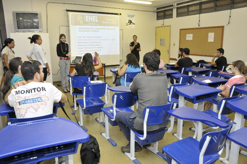 Estudantes do curso de Letras de todo o país estão reunidos no Câmpus Samambaia da UFG para discutir, entre outros assuntos, o ensino de Línguas e Literatura no país. Simultaneamente ao Encontro Nacional dos Estudantes de Letras (Enel), ocorre também o I Seminário Nacional de Libras (SNI). Na manhã do dia 19 de julho foi realizada uma mesa-redonda com a professora do curso de Letras – Libras da UFG, Neuma Chaveiro e seus alunos. O tema da mesa era discutir a aquisição de linguagem, no caso a Língua Brasileira de Sinais.