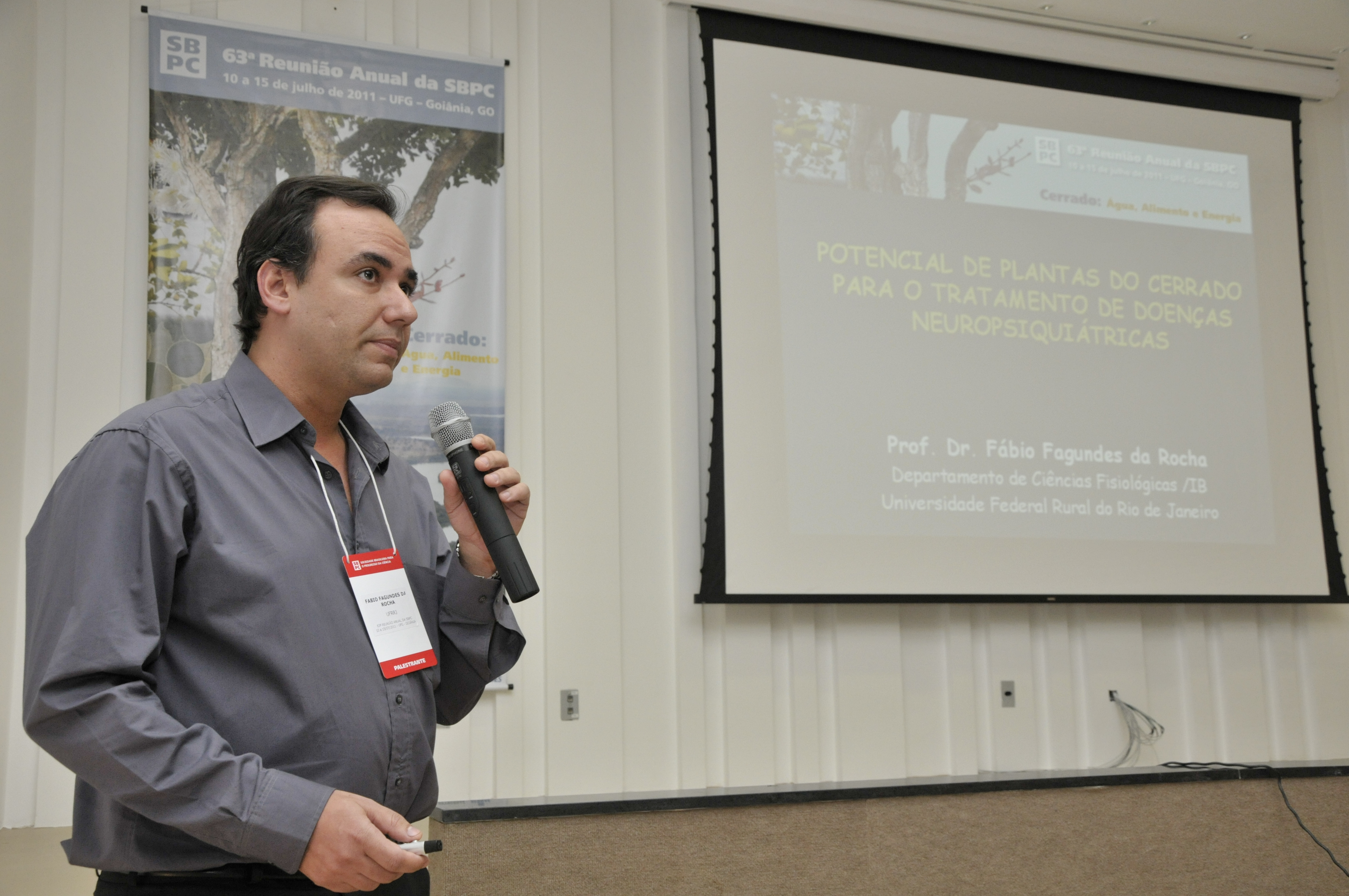A palestra do professor Fábio Fagundes da Rocha se concentrou nas pesquisas em busca de plantas com propriedades para tratamento de doenças neuropsiquiátricas. Segundo ele, medicamentos alternativos com menos efeitos colaterais e menor probabilidade de desenvolvimento de intolerância ou dependência por parte do paciente são uma forte demanda do mercado farmacêutico atual.