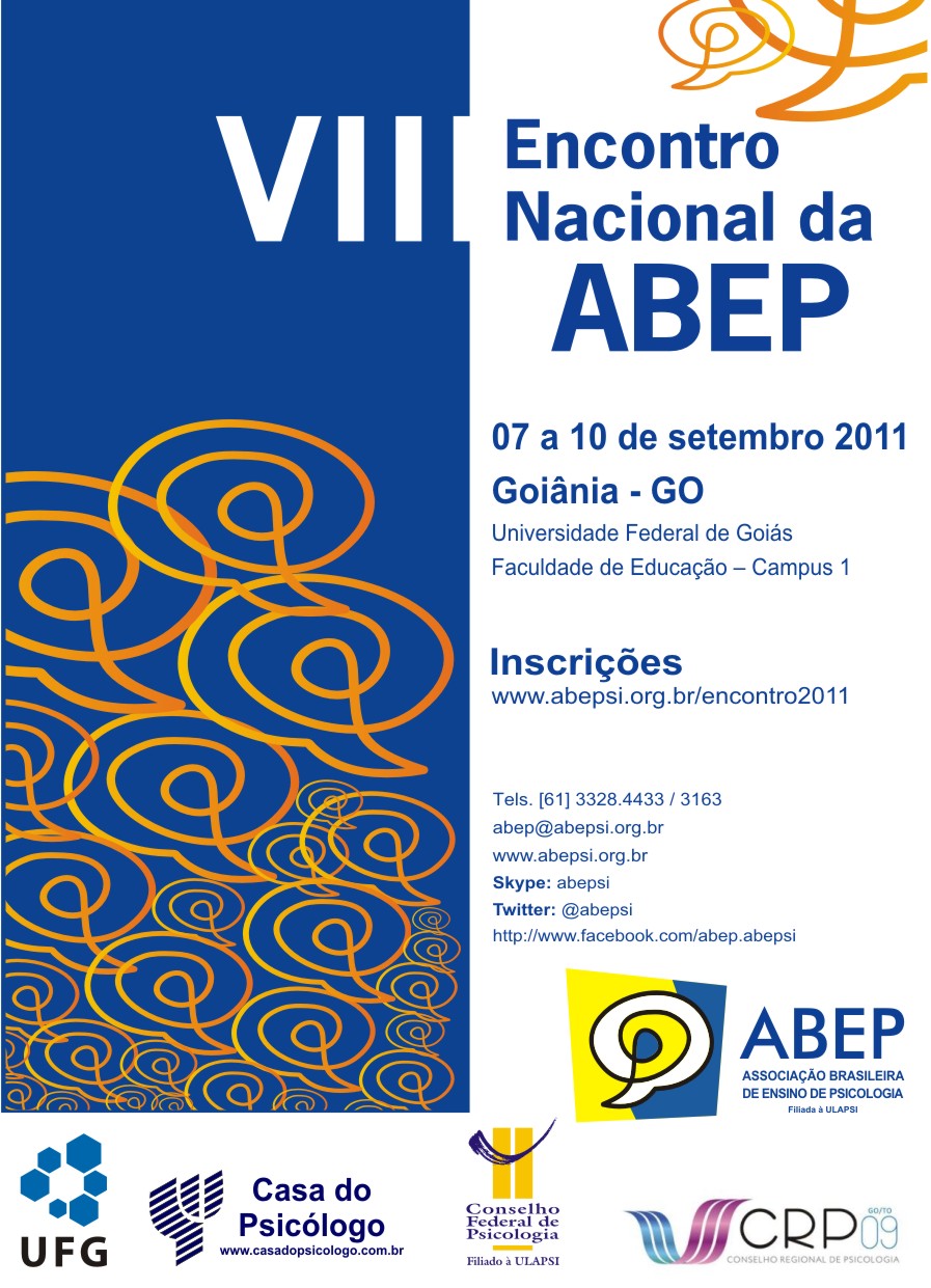 De 7 a 10 de setembro de 2011, Goiânia receberá o VIII Encontro Nacional da Associação Brasileira de Ensino de Psicologia (ABEP). Estudantes, professores e profissionais da área de Psicologia estarão reunidos para debater a formação acadêmica e o exercício da profissão no contexto atual. Serão realizadas conferências, mesas-redondas, apresentações de trabalhos, dentre outras atividades. As incrições podem ser feitas até o dia 31 de julho no site da ABEP.