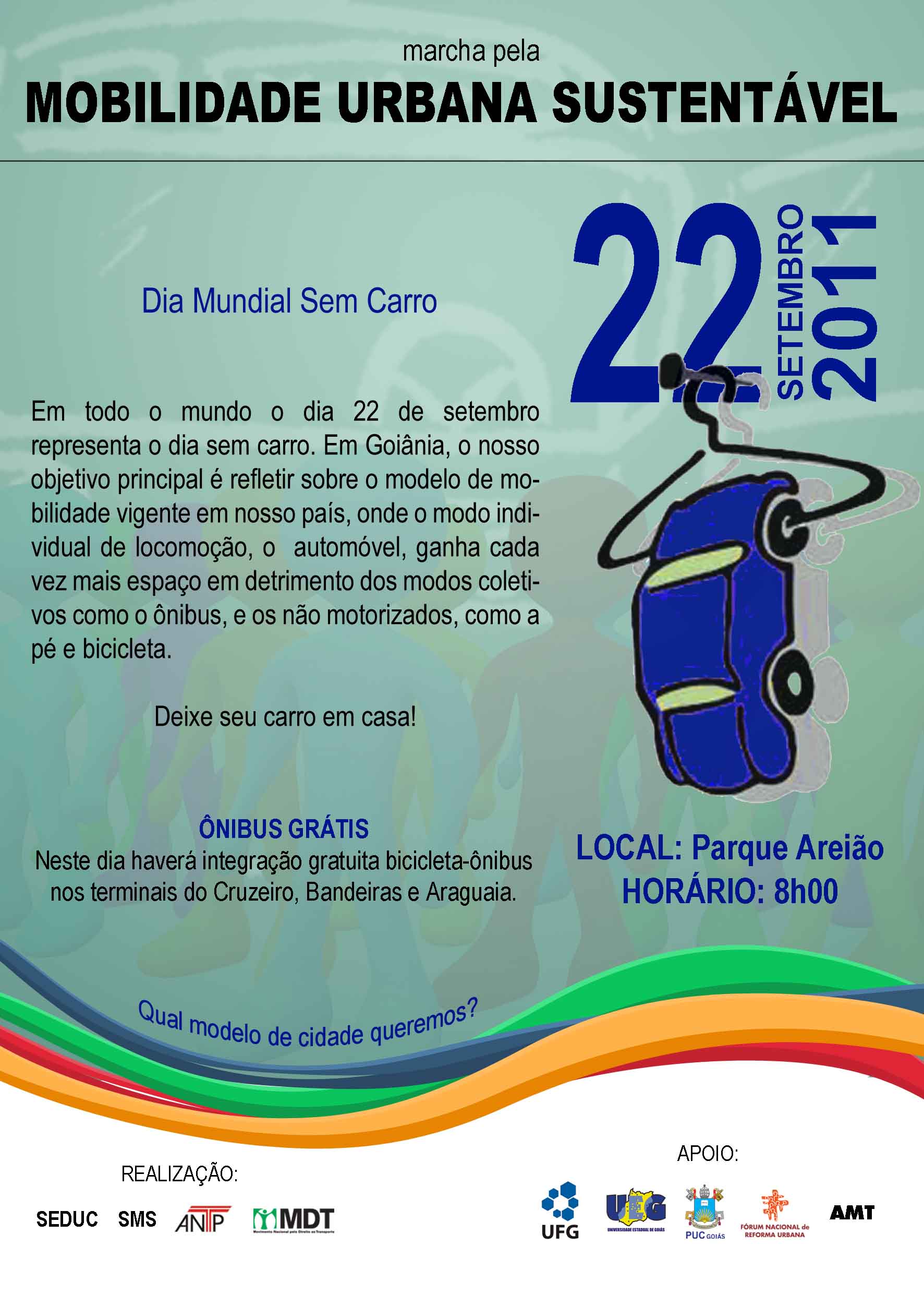 Dia 22 de setembro é o Dia Mundial Sem Carro. Frente à necessidade de uma cidade que não dê preferência aos carros em detrimento das pessoas, Goiânia terá diversas atividades na data, apoiadas pela prefeitura e pelo governo do estado e por diversas instituições e organizações não governamentais. Para facilitar o transporte no dia em que deixamos o carro em casa, haverá integração gratuita bicicleta-ônibus nos terminais do Cruzeiro, Bandeiras e Araguaia.