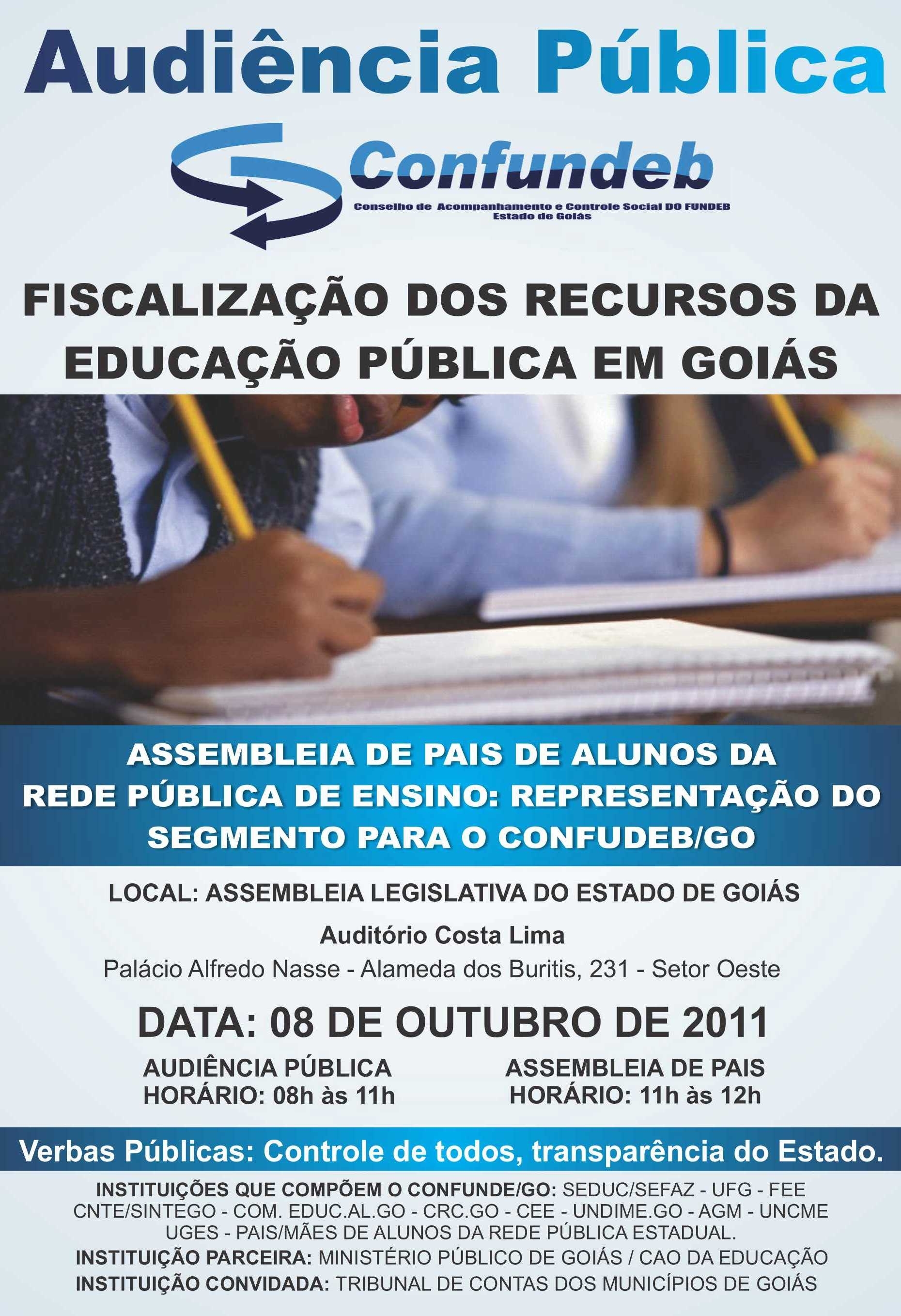 O Conselho Estadual de Acompanhamento e Controle Social do Fundo de Manutenção e Desenvolvimento da Educação Básica e de Valorização dos Profissionais da Educação (Confudeb/GO) convida para Audiência Pública sobre o tema “Fiscalização dos recursos da educação pública em Goiás”, a ser realizada na Assembleia Legislativa do Estado de Goiás, dia 08 de outubro, às 8 horas.