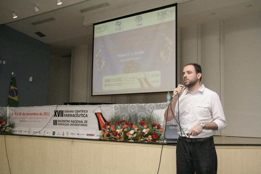 O professor Radif Domingos foi homenageado por ter sido o idealizador da Farmácia Escola da UFG e a professora Miriam por ter sido a primeira coordenadora da Farmácia Escola. Após a abertura o professor Rafael Guido do Instituto de Física da Universidade de São Paulo – São Carlos ministrou uma palestra sobre a Descoberta de Compostos- Líderes para o tratamento de doenças infecciosas. Ele ressaltou a cadeia de produção de fármacos (remédios e não drogas) que envolvem: conhecimento, pesquisa, inovação, gerenciamento de informações, altos investimentos e tecnologia. Tudo isso a partir da manipulação das moléculas em substâncias e os efeitos que elas podem trazer para curar uma doença, ou ameninar os efeitos, no ser humano.