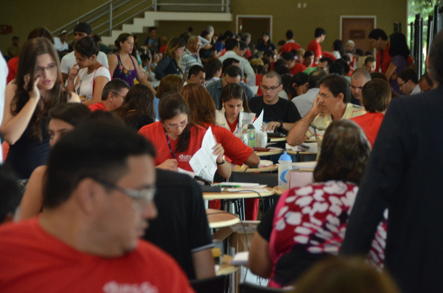 Veteranos recebem os calouros na porta do Centro de Eventos