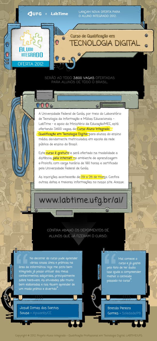 A Universidade Federal de Goiás, por meio do Laboratório de Tecnologia da Informação e Mídias Educacionais (LabTime) e com apoio do Ministério da Educação (MEC) e da Secretaria de Ensino Básico (SEB), está oferecendo 3.600 (três mil e seiscentas) vagas, do curso Aluno Integrado: Qualificação em Tecnologia Digital, para alunos do ensino médio, devidamente matriculados em qualquer escola da rede pública de ensino do Brasil. As inscrições vão de 9 a 26 de março e o curso começa no dia 16 de abril.
